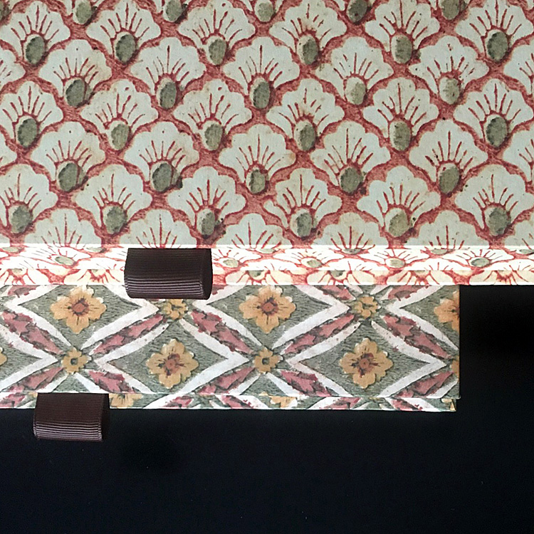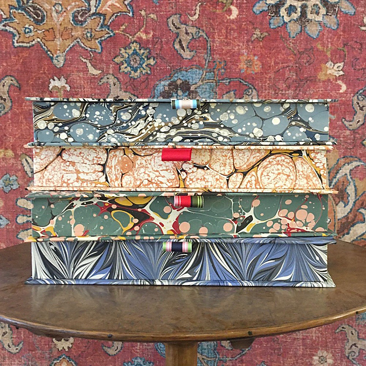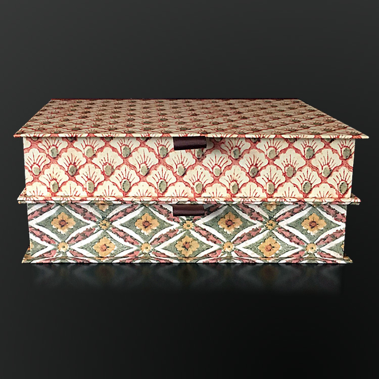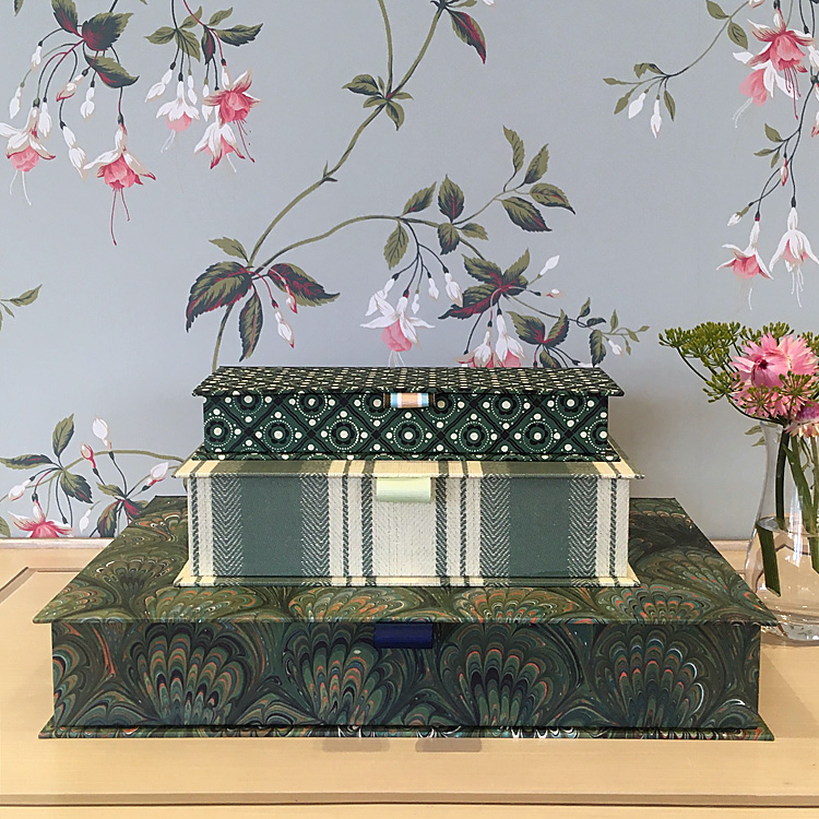 An A4 box file made of high quality rigid board, dressed in a choice of decorative papers and contrast lined. There’s a coordinating book cloth hinge for maximum elegance and durability and an smart ribbon tab for easy opening. Please see our paper gallery for the range of decorative papers available.