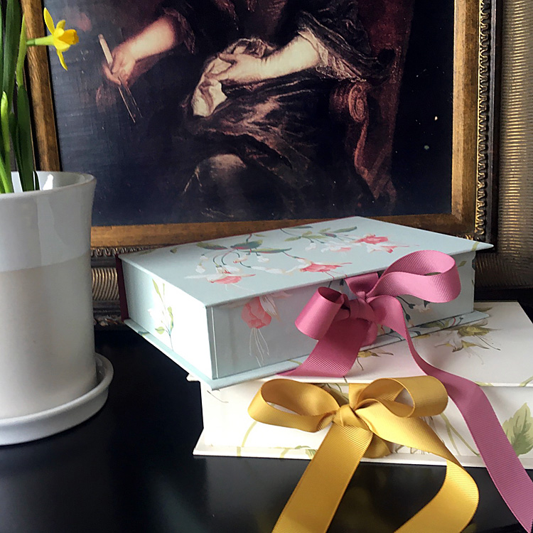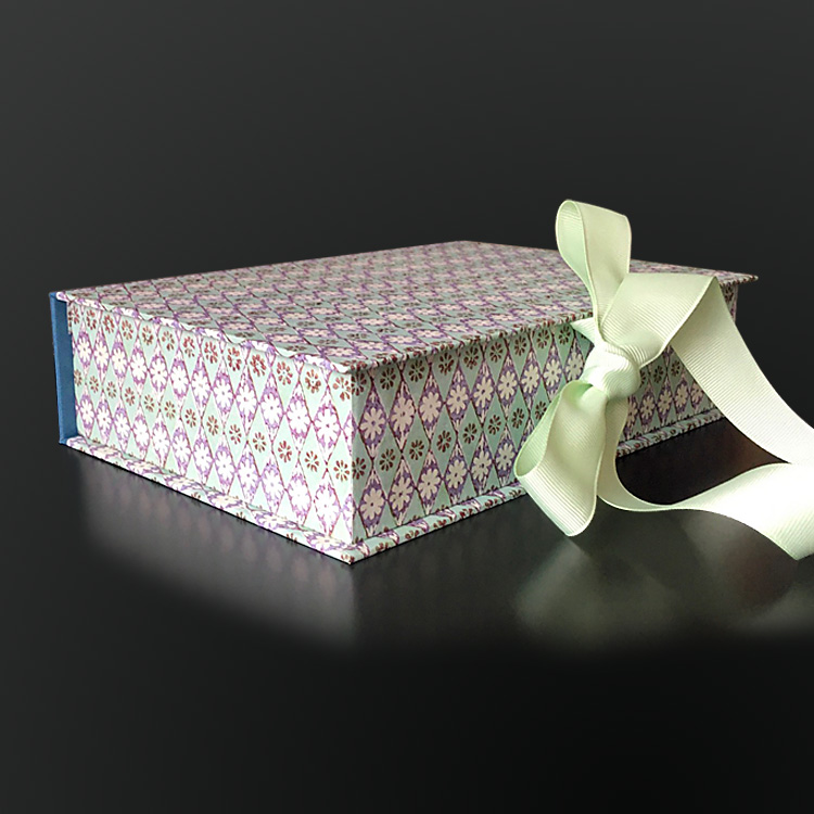 Made of high quality rigid board, lined inside and out with a choice of decorative papers. Please see paper gallery for options. There’s a coordinating book cloth hinge for maximum elegance and durability and a matching ribbon.