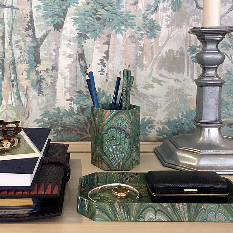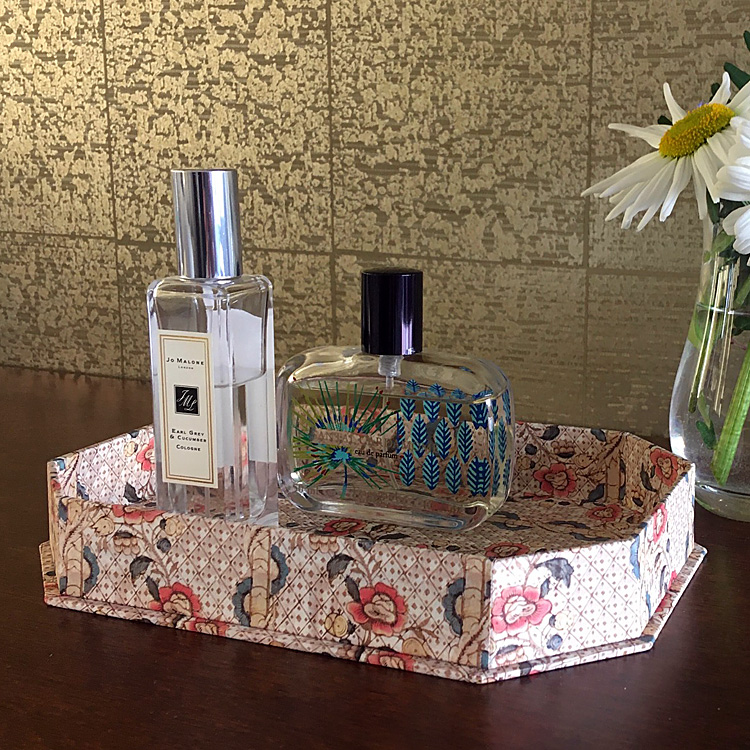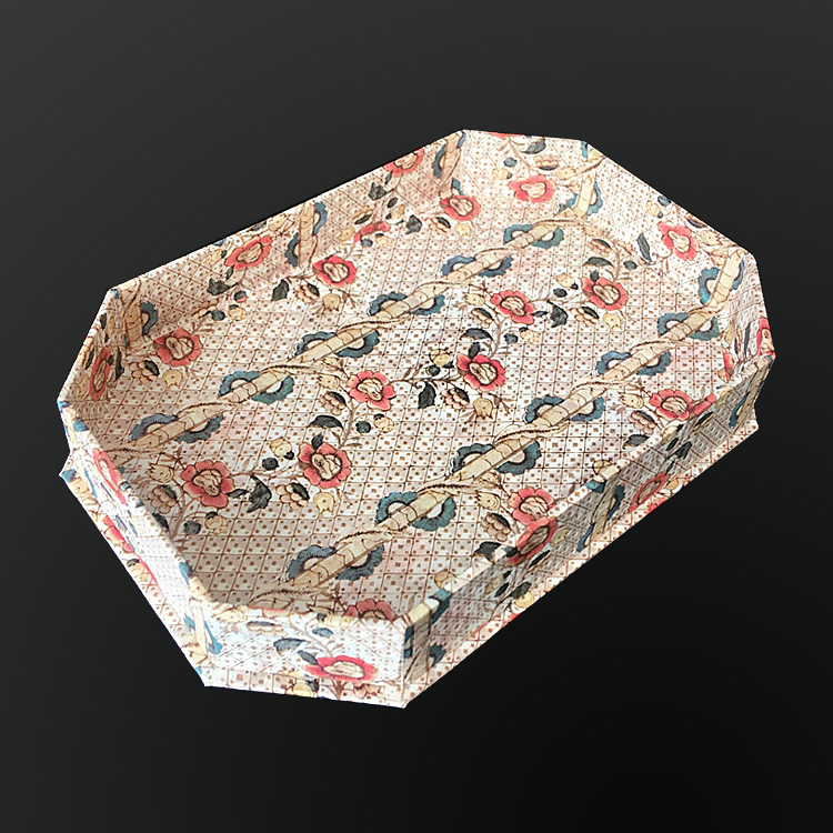 Octagonal Tray A sophisticated, elegant and useful addition to any desk or worktable. Available in two sizes, with either a flat base, or with a plinth. SmallLength: 20cm Depth: 10cmHeight: 2.5cm MediumLength: 25cm Depth: 15cmHeight: 3cm