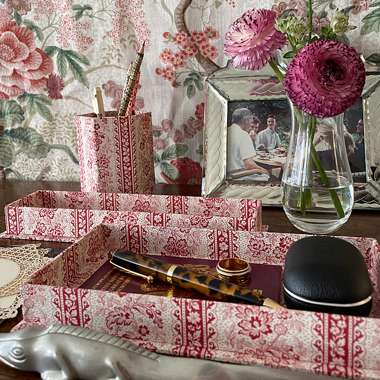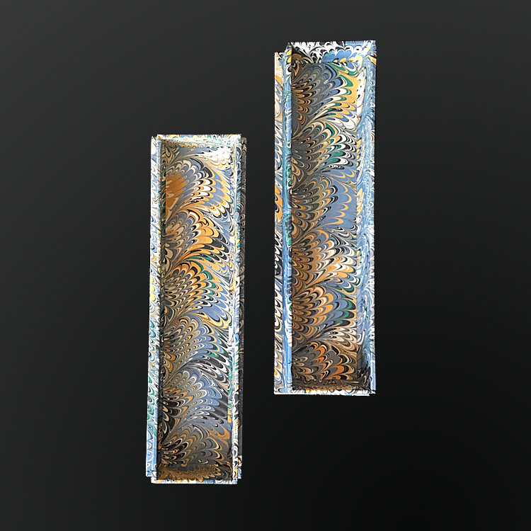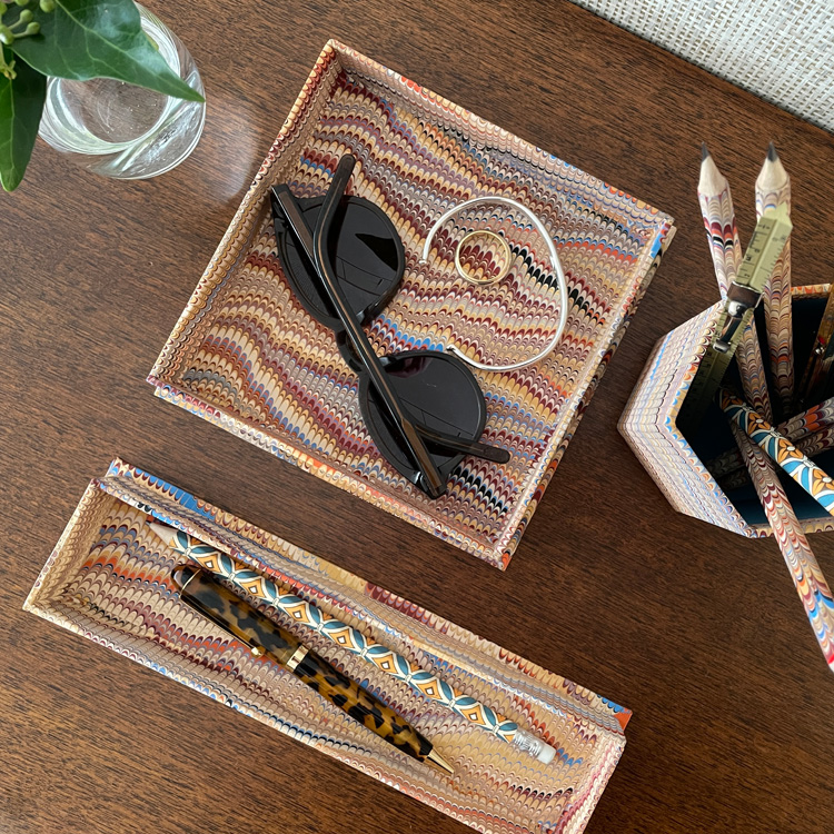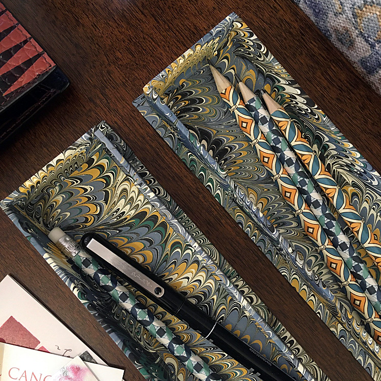 This slim tray for pens and pencils would equally make a special home for a favourite watch or bracelet. Each is hand crafted and meticulously dressed in a choice of decorative papers, please see the paper gallery. These trays come in two sizes, with and without bases.