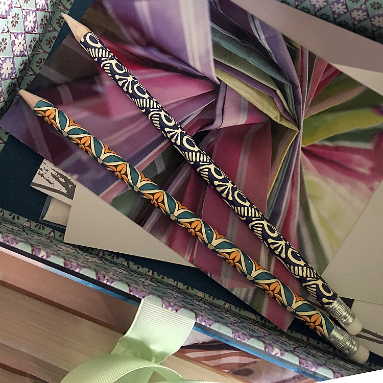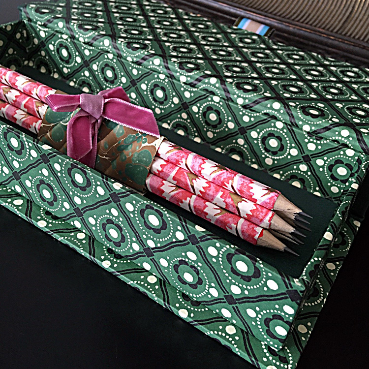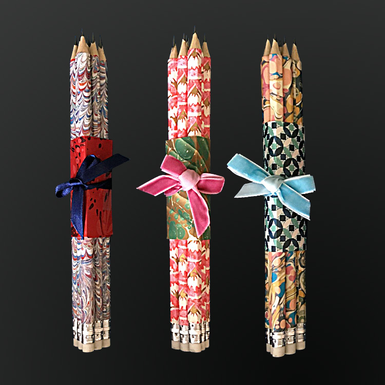 Wrapped Pencils Hexagonal HB pencils are rolled by hand with decorative paper and come in sets of five.
